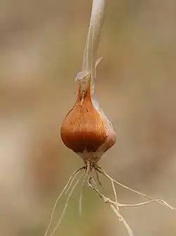 Луковица яйцевидная, диаметром 1 см, наружные оболочки бурые, кожистые, раскалывающиеся, с сильными, почти сетчатыми, жилками. Луковички немногочисленные, крупные, крылатые, желтоватые, с тонкими жилками. Стебель одиночный, иногда в числе двух, высотой 15—40 см, при основании или на четверть одетый сближенными, гладкими влагалищами листьев.