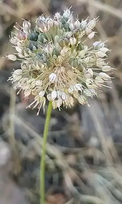 Чехол остающийся, в полтора—три раза длиннее зонтика. Зонтик шаровидный или полушаровидный, обычно многоцветковый, густой. Листочки яйцевидного околоцветника бледно-желтовато-зеленоватые, розовеющие, продолговато-ланцетные, острые, длиной 3—4 мм, наружные немного короче внутренних. Нити тычинок в полтора раза длиннее листочков околоцветника, при самом основании между собой и с околоцветником сросшиеся, цельные, шиловидные, равные. Столбик выдается из околоцветника.