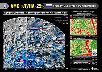 - ↑ Ученые выбрали два возможных места посадки для российской станции «Луна-25». ТАСС (25 января 2018). Дата обращения: 26 июня 2020. Архивировано 31 августа 2020 года.