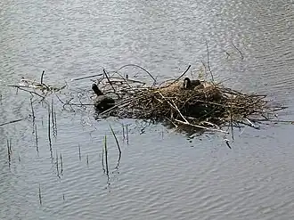 Гнездо устраивается на воде, посреди густых зарослей тростника, камыша, рогоза, ситника, ежеголовника или другого выступающего из воды растения. Обычно гнездо своим основанием опирается на дно, но также может быть и полностью плавучим, тем не менее хотя бы частично опираясь на растения. Построенное из листьев и стеблей прошлогодних трав, гнездо представляет собой грубую рыхлую кучу, размеры которой варьируются в широких пределах — их высота может составлять от 11 до 20 см, диаметр от 26 до 39 см, а диаметр лотка около 22-23 см[13]. Строят гнездо оба: самец и самка.