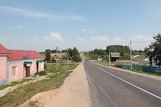 Ляды, усыпальница Шнеерсона. Художник А. Наливаев- Вид на храм в д. Ляды и магазин. Дорога идёт на запад