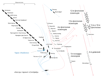 Крейсера отвернули и попытались укрыться за строем линкоров, «Эльбинг» попал в 0:30 1-го июня 1916 года под таран флагмана контр-адмирала Энгельгардта линкора «Позен», после чего затонул. Погибло 4 человека[8]. В 2:25 миноносец S-53 подошёл к борту крейсера, 477 человек перебрались на миноносец, на борту «Эльбинга» остались командир, старший офицер, подрывная команда и команда гребного катера, состоявшая из добровольцев[13].