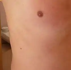 При объективном обследовании определяется выпячивание грудной стенки, мягко эластической консистенции, увеличивающееся при кашле, натуживании или любом другом физическом напряжении (рис. 2). Иногда пальпаторно определяется дефект мягких тканей в межрёберном промежутке и ограничивающие его участки прилежащих рёбер.