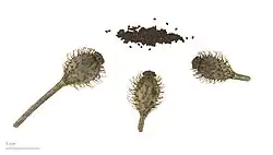 Плод — широко-овальная, довольно крупная коробочка, 10—14 мм длиной, покрытая жёсткими, отстоящими и часто несколько назад отогнутыми щетинками. Семена чёрные, округлые, с прямоугольной крупной сеткой ячеек.