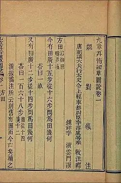 - 方田 Фан тянь, «Измерение полей» — Вычисление площадей: треугольники, многоугольники, круг, сегменты и секторы круга, круговое кольцо (судя по пояснениям, автор принимал, что )[2]. Операции с дробями. Алгоритм поиска наибольшего общего делителя двух чисел, аналогичный евклидовскому.