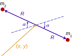 В качестве менее тривиального примера рассмотрим два точечных объекта с массами m1, m2, прикреплённых к концам жесткого безмассового стержня длиной 2R, причём узел может свободно вращаться и скользить по фиксированной плоскости. Состояние системы можно описать обобщённым координатным вектором