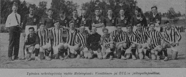 - ↑ Состав сборной команды организации финских рабочих клубов TUL (Työväen Urheiluliiton jalkapallojoukkue) в данном конкретном матче, в отличие от предыдущих встреч с советскими командами, был составлен из сильнейших футболистов. Несмотря на то, что в указанный период времени футболисты TUL не участвовали в «буржуазном» чемпионате и матчах национальной сборной, в составе этой команды, занявшей немногим более месяца спустя второе место на рабочей Олимпиаде во Франкфурте, выступали значимые игроки финского футбола тех лет — Рейно Фри, Эйно Рантанен, Эрнст Грёнлунд и другие.