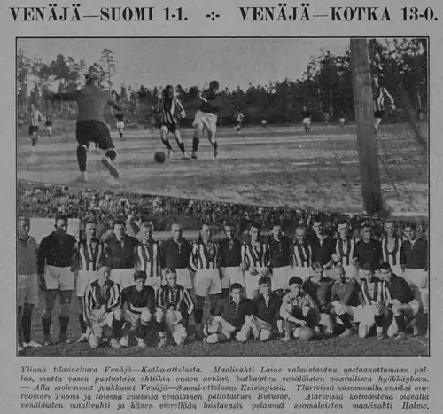 - ↑ Сильнейший (финны называли его «спартакиадным») состав сборной команды организации финских рабочих клубов TUL (Työväen Urheiluliiton jalkapallojoukkue). За проведение матча с советскими футболистами все игроки команды и арбитр были исключены из TUL (повторный матч через две недели ленинградцы играли уже с резервистами), после чего они перешли в клубы «буржуазного» чемпионата и стали выступать за национальную сборную. Целый ряд игроков этого состава весьма значим в финском футболе тех лет — Рейно Фри, Эрнст Грёнлунд (37 матчей за национальную сборную), Вильо Хальме (30 матчей), Лаури Синикари-Практиг (5) и другие.