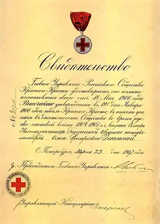 - 1 2 3 4 Ордена и медали России. Медаль Красного Креста «В память русско-японской войны 1904-1905 гг.» rusorden.ru. Дата обращения: 1 ноября 2012. Архивировано 26 ноября 2019 года.