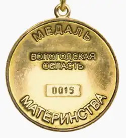 - ↑ Закон Вологодской области от 6 декабря 2006 года № 1528-ОЗ «Об учреждении государственной награды Вологодской области — медали „Медаль материнства“» Архивная копия от 23 декабря 2017 на Wayback Machine. // Законодательство Вологодской области. 2006. № 6 (ч. 1). С. 125.