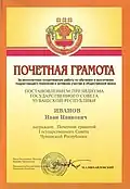 Почётная грамота Государственного Совета Чувашской Республики учреждена для награждения граждан, предприятий, учреждений и организаций Чувашской Республики за большой вклад в реализацию программ социально-экономического развития Чувашской Республики, в развитие законодательства и правовой системы, местного самоуправления, а также за конкретные достижения при осуществлении мер по обеспечению правопорядка, законности, прав и свобод граждан. Почётной грамотой могут быть награждены граждане, проживающие в других субъектах Российской Федерации, а также иностранные граждане за существенный вклад в развитие межпарламентских связей и парламентаризма, укрепление дружбы народов. Лица, награждённые Почётной грамотой, повторно могут представляться к этой награде не ранее чем через 5 лет после предыдущего награждения. |
