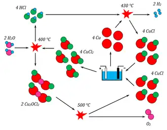 Цикл Cu – Cl включает четыре химические реакции расщепления воды, итоговая реакция которых разлагает воду на водород и кислород . Все остальные химические вещества возвращаются в цикл. Процесс Cu – Cl может быть связан с ядерными установками или другими источниками тепла, такими как солнечная энергия и промышленные отходы тепла, чтобы потенциально достичь более высокого КПД, меньшего воздействия на окружающую среду и более низких затрат на производство водорода по сравнению с любой другой традиционной технологией.