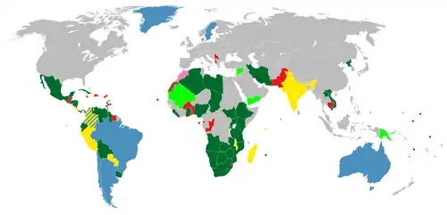 - ↑ Признание к Сербии от Югославии произошло по продолжательству Сербией от Сербии и Черногории, которая считала себя правопреемницей СФРЮ и была признана таковой со стороны России и Китая.