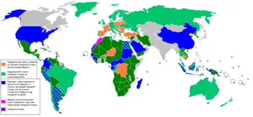 Западная Сахара, ранее Испанская Сахара, является спорной территорией между Королевством Марокко и Сахарской Арабской Демократической Республикой. Её правовым статусом, по мнению ООН, является недеколонизованная территория (включена в список ООН несамоуправляющихся территорий). ООН не признаёт чьего-либо суверенитета над Западной Сахарой (ни САДР, ни Марокко)[1]. В таком статусе Западную Сахару признают 117 из 194 общепризнанных государств мира. При этом некоторые из них (например, США, Франция и другие) рассматривают её как марокканскую колонию. Другие (например, Россия, Германия и другие), напротив, не считают, что после отказа Испании от Испанской Сахары у Марокко появились какие-либо права на данную территорию. Отличаются и мнения стран касательно возможных вариантов решения конфликта: от создания независимого государства до полной интеграции в Королевство Марокко. Такие неопределённости привели к тому, что большинство государств вынуждены самостоятельно выбирать: заключать ли договоры с марокканскими властями, либо с ПОЛИСАРИО по таким важным вопросам как марокканская экономическая зона в открытом море (например, договор с ЕС признаёт распространение этой зоны и на побережье Западной Сахары, хотя ни одно государство-член ЕС не признаёт суверенитет Марокко над ней) или разработка нефтяных месторождений в Западной Сахаре и на её континентальном шельфе (лицензии на разведку и разработку месторождений раздают и Марокко, и Сахарская Арабская Демократическая Республика[2]).