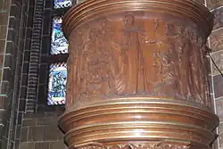 - резьба на кафедре проповедника изображает Иисуса Христа, окружённого солдатами в касках и арийскими женщинами и детьми[5]
