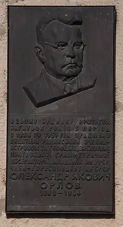 Мемориальная доска в честь астронома, академика АН УССР Александра Яковлевича Орлова |