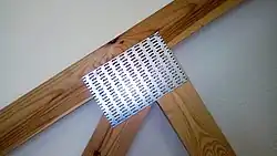 Металлическая зубчатая пластина комбинирует в себе фасонку (накладку) и нагель, не требуя применения дополнительного закрепления гвоздями или болтами, в отличие от перфорированной пластины.
