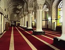 Главный зал состоит из восьми мраморных колонн с большим куполом наверху, с которых свисают железные цепи, удерживающие люстры.[13] Вокруг большого купола три других купола, построенные на трех прямоугольных колоннах из камня и гипса. Купол главного зала, двери и колонны украшены мелкими аккуратными украшениями.[13] Стены также покрыты иорданским мрамором на высоте трех метров над землей. В главном зале находились две ниши, покрытые геометрическими мотивами, вокруг которых были построены четыре колонны.[13]