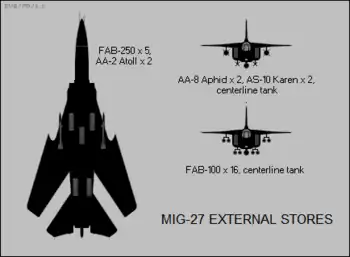 МиГ-27 (изделие 32-25, по кодификации НАТО: Flogger-D) — советский сверхзвуковой истребитель-бомбардировщик третьего поколения[2] с крылом изменяемой стреловидности. Силовая установка однодвигательная. Предназначен для нанесения ударов по подвижным и неподвижным наземным и воздушным целям. Может нести тактическое ядерное оружие.