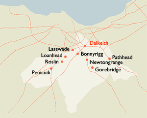 Округ Мидлотиан граничит с городом Эдинбург на западе и областями Ист-Лотиан на востоке и Скоттиш-Бордерс на юге.