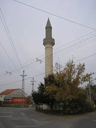 Минарет высотой 23 метра (75 футов) был построен в XVII веке как часть мечети османскими мусульманами и использовался для призыва мусульман к молитве (азан)[2]. Историк Йожеф Молнар описывает мечеть как прямоугольное богато украшенное здание с красочными окнами, коврами и михрабом (молитвенной нишей) напротив входа в каменную раму двери с защищенным деревянными решетками балконом, по которому муэдзин пробирался к минарету. Структура башни минарета состоит из отдельно стоящего цилиндрического основания, конического перехода и многоугольной верхней части[3]. Среднее и верхнее закрытия являются реставрациями и реконструкциями. Входной проем сегментирован и расположен выше от земли[1][4].