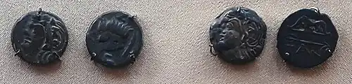 - Экземпляры того же типа, чеканенные на монетных кружках более маленького размера, часто со следами литников, 624 штуки (у одной из монет этой группы на реверсе — вдавленное изображение головы сатира, лат. nummus incusum)[19];