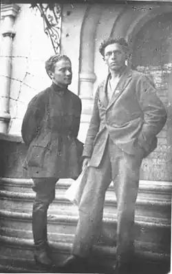Группа белорусских писателей. Слева направо стоят: Альберт Павлович (бел. Альбэрт Паўловіч), Михась Чарот, Владислав Голубок и Язеп Фарботка (бел. Язэп Фарботка). Май-июнь 1920, Минск. Вероятно, это один из снимков сотрудников и активных корреспондентов журнала «Рунь» после выхода его последнего (10-го) номера[1].