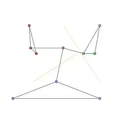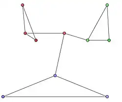 Сообщества в графе представлены красными, зелёными и синими узлами кластеров на рис. Fig 1. Оптимальное разбиение на сообщества представлено на рис. 2.