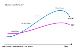 Цикл начинается с низшей точки, в которой экономика оказалась в результате предыдущего цикла. После того, как экономика оказалась на дне, начинается длительный период экономического роста и оживления активности на финансовых рынках. В этот период инвесторы относятся к перспективам роста настороженно, так как помнят о последствиях сверхоптимизма, который привёл к предыдущему кризису. Доминируют консервативно настроенные инвесторы. По мере роста экономики растут цены на финансовые активы. Последствия предыдущего кризиса забываются и начинают преобладать оптимистичные спекулятивные настроения. Инвесторы активно используют финансовый рычаг, в результате чего накапливаются долги, а цены на активы отрываются от реальных темпов роста экономики. В точке наивысшего подъёма рынка наступает момент Мински, когда инвесторы осознают, что долги невозможно вернуть, а активы сильно переоценены. Попытка вернуть долги ведёт к волне распродаж и обвалу рынка. В результате всё заканчивается финансовым и экономическим кризисом.