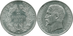 | 1853 | Серебро | 2 г | 18 мм | 1853 — 1863 | рубчатый | Номинал | Наполеон III | Всего выпущено: — 1 009 907 шт. |