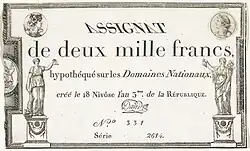 2 января 1795 года (13 нивоза III года), ещё до официального введения франка в качестве денежной единицы, был принят декрет Национального конвента о выпуске ассигнатов во франках.
