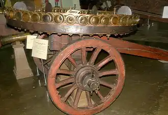 Батарея устанавливалась на двухколёсном лафете специальной конструкции, в хоботовой части которого имеется винтовой подъёмный механизм для придания угла возвышения. Однако, большого угла возвышения добиться не удавалось и гранаты летели недостаточно далеко. Короткий ствол не давал возможности стрелять картечью. Из-за силы многочисленных выстрелов лафет быстро выходил из строя[1].