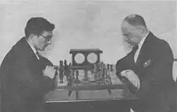 1. e4 c5 2. Кc3 Кc6 3. g3 g6 4. Сg2 Сg7 5. Кge2 d6 6. d3 Кf6 7. 0-0 0-0 8. h3 a6 9. Сe3 Сd7 10. Фd2 Лe8 11. Кd1 Лc8 12. c3 Фa5 13. g4 Лed8 14. f4 Сe8 15. g5 Кd7 16. f5 b5 17. Кf4 b4 18. f6 Сf8 19. Кf2 bc 20. bc e6 21. h4 Лb8 22. h5 Лb6 23. hg hg 24. Кd1 Кde5 25. Фf2 Кg4 26. Фh4 Кce5 27. d4? К:e3 28. К:e3 Ф:c3! 29. de Ф:e3+ 30. Крh1 de 31. Лf3 (см. диаграмму)