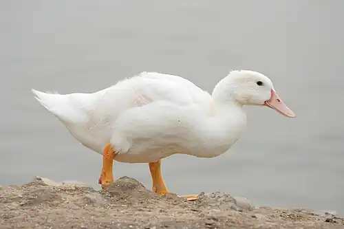 Имеет большую, длинную голову, длинный бело-розовый клюв, темно-голубые глаза. Шея длинная, но средней толщины, грудь широкая. Спина длинная и широкая, туловище при этом тоже широкое и длинное, ноги короткие оранжевого оттенка.[2][1]