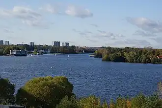 В 1932—1937 годах по плану второй пятилетки в Москве был построен целый комплекс гидротехнических объектов (более 240), использующих волжскую воду из канала имени Москвы[39]. Канал был одной из «строек века» в СССР — он коренным образом изменил систему водоснабжения Москвы и сделал её «портом пяти морей»[40]. За четыре года и восемь месяцев строительства канала было проведено более 200 млн м³ земляных работ и уложено 29 млн м³ бетона, на стройке работало больше миллиона человек. Запуск канала решил сразу несколько важных задач: подачи питьевой воды в столицу, улучшения санитарного состояния рек внутри города, выработки энергии и обеспечения судоходной связи с Волгой[41].
