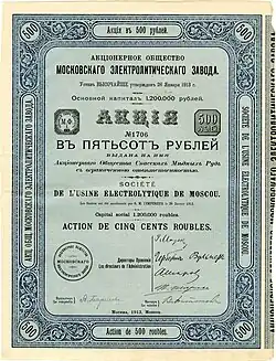 - ↑ Акционерное общество Московского электролитического завода, акция в 500 рублей, выдана Товариществу Латунного и меднопрокатного заводов Кольчугина, 1913 год. hisdoc.ru. Дата обращения: 29 марта 2023. Архивировано 19 февраля 2020 года.