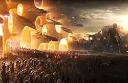 Мстители, возглавляемые Капитаном Америкой (Крис Эванс), собираются на главную Битву за Землю. Сцена «Битва за Землю» была оценена в «/Film» как улучшение фильма «Мстители: Финал»[1], и её элементы были тепло приняты аудиторией кино[2][3][4]