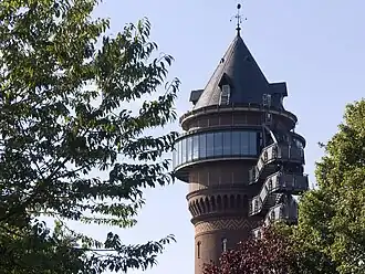 В 1892—1893 годах по распоряжению Августа Тиссена в тогда еще отдельном городе Штирум сооружается 50-метровая водонапорная башня. Башня строилась с целью обеспечения водой прокатных цехов завода Тиссена, а также для нужд местных жителей. В 1904 году Штирум входит в состав города Мюльхайм-ан-дер-Рур. В 1912 году башня передается в ведение только что созданного Рейнско-Вестфальского гидротехнического общества («RWW Rheinisch-Westfälische Wasserwerksgesellschaft mbH»), которое владеет башней и по сей день.