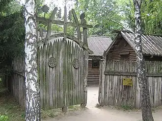 Жилищно-хозяйственный комплекс: — усадьба киевлянина X века, созданная на основе экспонируемых двух срубов. Усадьба ограждена высоким частоколом. В ней жилище и хозяйственная постройка. Сооружения сложены из сосновых брёвен «в сруб». Крыши двухскатные.