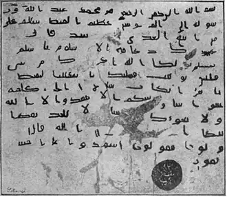 1. «the original of the letter was discovered in 1858 by Monsieur Etienne Barthelemy, member of a French expedition, in a monastery in Egypt and is now carefully preserved in Constantinople. Several photographs of the letter have since been published. The first one was published in the well-known Egyptian newspaper Al-Hilal in November 1904» Muhammad Zafrulla Khan, Muhammad: Seal of the Prophets, Routledge & Kegan Paul, London, 1980 (chapter 12 Архивная копия от 3 декабря 2016 на Wayback Machine). The drawing of the letter published in Al-Hilal was reproduced in David Samuel Margoliouth, Mohammed and the Rise of Islam, London (1905), p. 365, which is the source of this image.