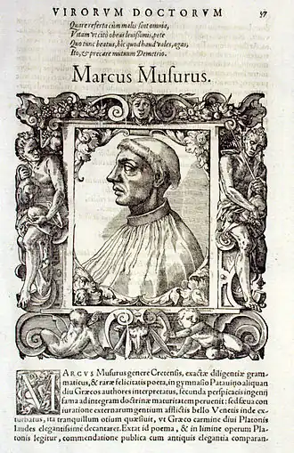 Маркос Мусурос (греч. Μάρκος Μουσοῦρος; итал. Marco Musuro; Ретимнон, Королевство Кандия, около 1470 — Рим, 1517)[6] — греческий учёный, издатель и один из самых значительных филологов Возрождения.