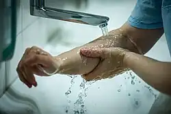 В медицине мытьё рук занимает минимум 15 секунд, должно применяться обильное количество мыла (или иного средства) так, чтобы тщательно обработать все участки на руках[115]. В европейском здравоохранении различаются отдельные процедуры, например, стандарты EN-1499 (гигиеническая обработка рук) и EN-1500 (дезинфекция)[116]. Ладони следует тереть друг о друга, соединив пальцы. Если загрязнены зоны под ногтями, следует использовать специальную щёточку. Поскольку микробы могут оставаться в воде, оставшейся на руках, важно хорошо ополаскивать руки и вытирать насухо чистым полотенцем. Вытерев руки, следует выключать воду (и при необходимости открывать дверную ручку) использованным бумажным полотенцем. Это позволит избежать повторной контаминации кожи рук микробами с этих поверхностей[13].