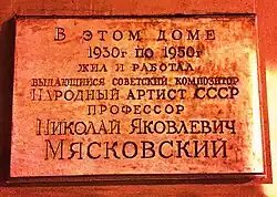 Мемориальная доска на доме № 4 по Сивцеву Вражку, где Н. Я. Мясковский провел последние два десятилетия жизни