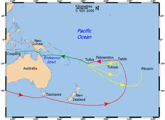 Блая и верных членов экипажа высадили в шлюпку в океане на расстоянии 56 км от ближайшего острова Тофуа. Сначала Блай направился к острову в надежде пополнить провиант и запасы воды, но туземцы на нём оказались чрезвычайно враждебно настроены — в столкновениях с ними погиб один член экипажа, а самому Блаю чудом удалось уйти от преследования. Таким образом, учитывая беззащитность экипажа, было принято решение избегать островов и туземцев и направляться к острову Тимор, где находилась ближайшая нидерландская колония. Вооружённый лишь компасом, квадрантом, секстантом и собственными часами, без морских карт, Блай начал многокилометровое путешествие до Тимора. С присущей ему педантичностью Блай установил ежедневный рацион продовольствия с тем, чтобы его хватило на всё плаванье, однако количество еды было настолько мало, что очень скоро команда начала страдать от недоедания[8].