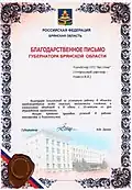 Благодарственное письмо Губернатора Брянской области является формой поощрения Губернатора Брянской области граждан Российской Федерации, иностранных граждан, а также коллективов организаций, предприятий различных форм собственности за развитие социальной, культурной, экономической сфер, благотворительную и другую деятельность, направленную на благо Брянщины, а также личного состава воинских частей Вооруженных Сил Российской Федерации, Министерства внутренних дел Российской Федерации, Федеральной правительственной связи и других формирований, расположенных на территории области, за осуществление мер по обеспечению законности, прав и свобод граждан, доблестное служение и другие заслуги (достижения) перед областью. |