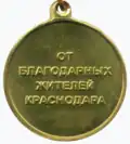 Памятная медаль «Освободителю Краснодара» учреждена городской Думой города Краснодара в честь 70-летия освобождения города Краснодара от немецко-фашистских оккупантов в 1943 году. Медалью награждаются ветераны Великой Отечественной войны, ветераны и инвалиды боевых действий, ветераны военной службы, участники освобождения Краснодара, граждане, внёсшие большой вклад в патриотическое воспитание молодёжи, реализующие общественно-полезную деятельность, направленную на увековечении памяти о Великой Отечественной войне. Памятная медаль «Освободителю Краснодара» носится на левой стороне груди ниже государственных и ведомственных наград. |