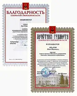 - Награды Губернатора Тверской области: