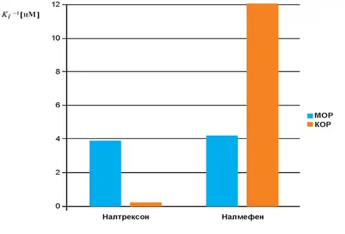 Налмефен — опиоидный антагонист с преимущественным сродством к κ-опиоидному (KOP) и μ-опиоиднму (MOP) рецептору. Сродство (аффинность, Ki) к KOP рецептору в 3 раза выше, чем к MOP и составляет 0.08 нМ и 0.24 нМ, соответственно[5].
