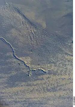 ![]() Река от дельты до урочища Урд-Борэг. Виден крупнейший левый приток, Хойт-Гол, и поросшее кустарником урочище Тугай-Бажи. | |