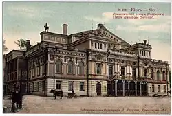 Здание театра было сооружено в 1898 году на Николаевской площади, появившейся на месте засыпанного пруда, располагавшегося в усадьбе киевского профессора Меринга. Театральное здание возводилось архитекторами Е. П. Брадтманом и Г. П. Шлейфером для театра «Товарищество драматических артистов» Николая Соловцова, ставшего впоследствии основой труппы другого киевского театра — им. Леси Украинки[1]. Зал театра оформлен в стиле рококо.
